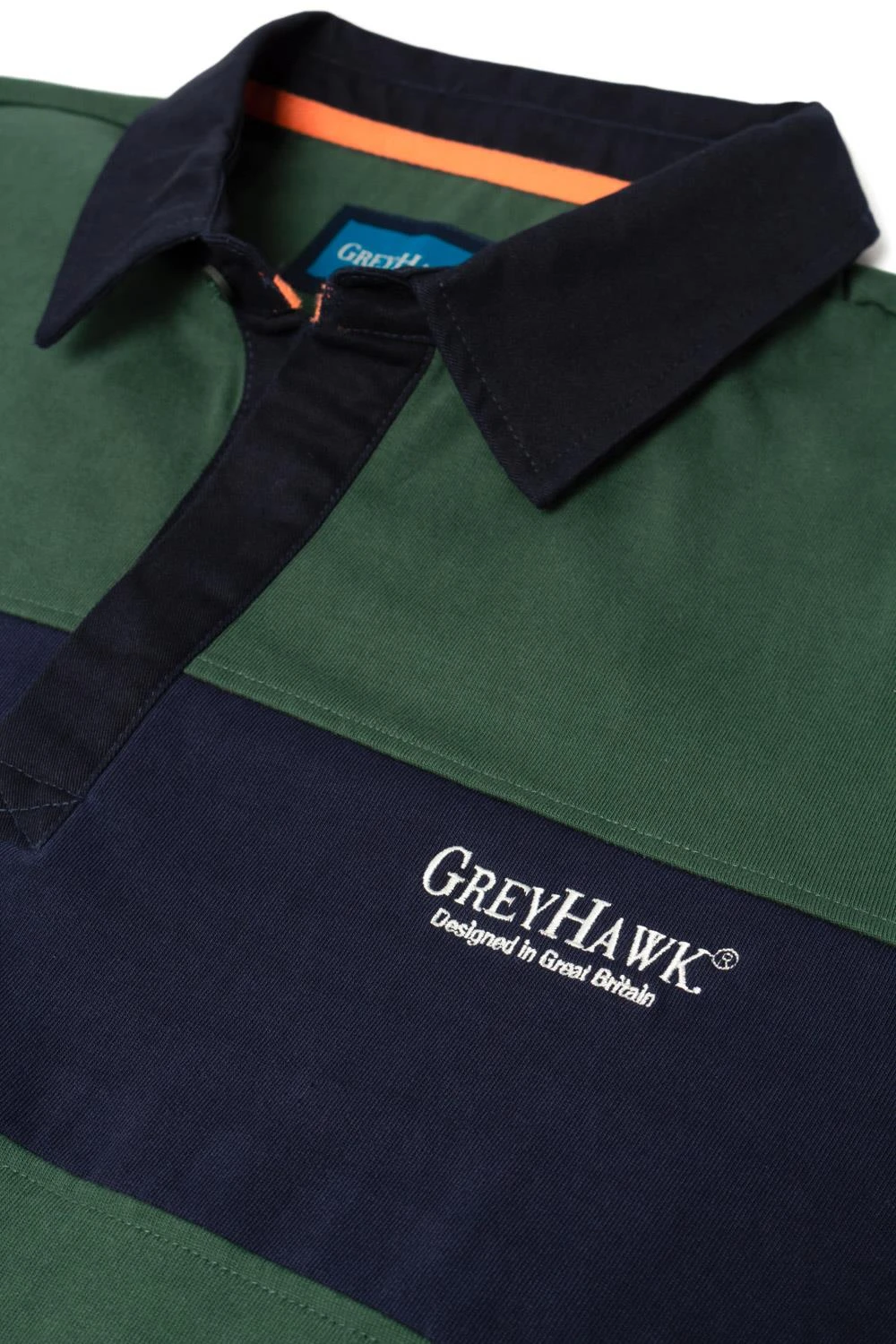 - Contrast navy collar with rugby style button covering