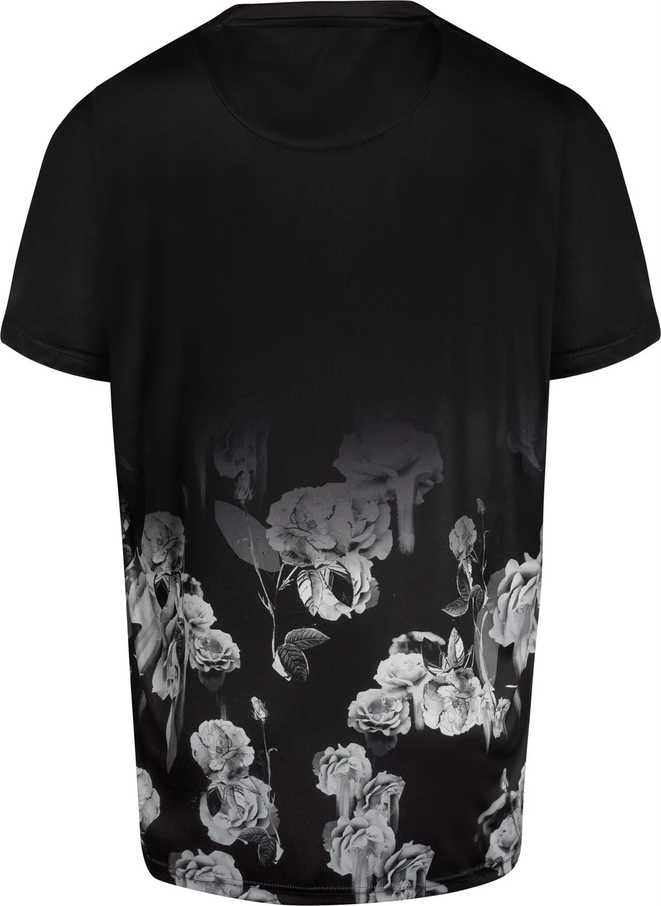 - Floral fade print behind logo