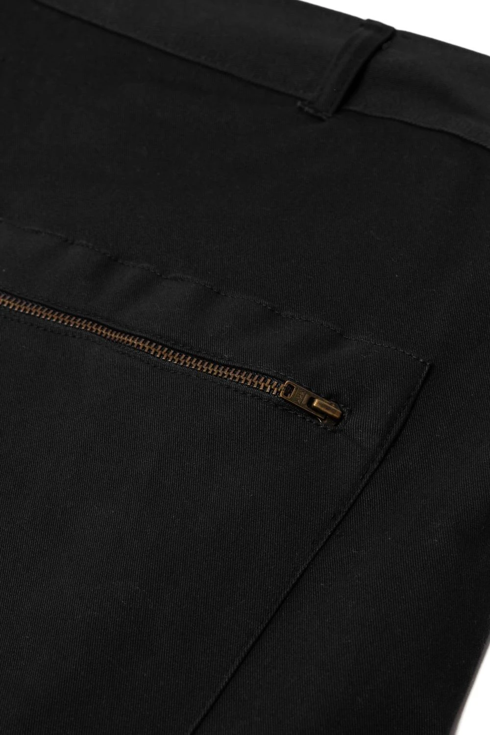 - Zip pocket above left leg bellow pocket with antique silver finish