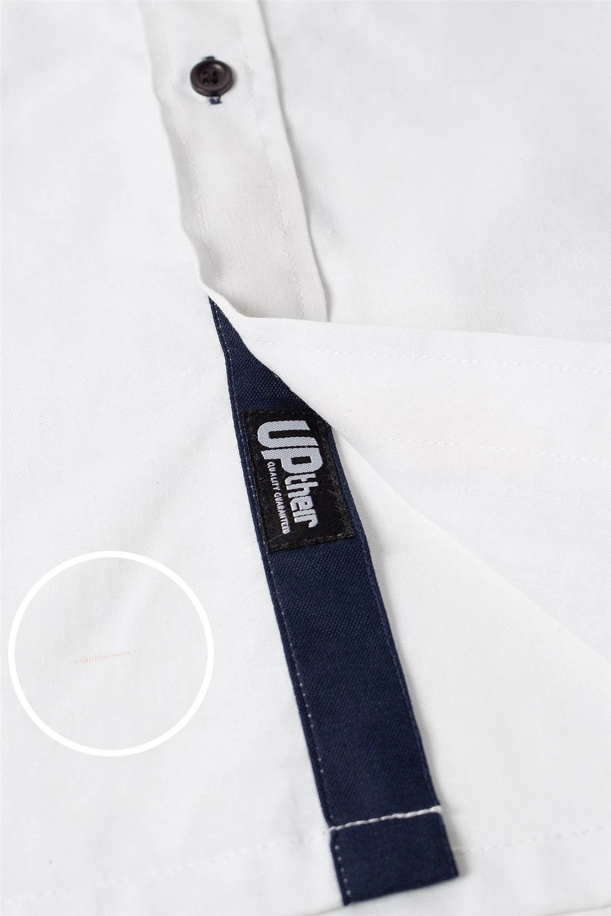 - Contrast navy inner collar and inner button stand